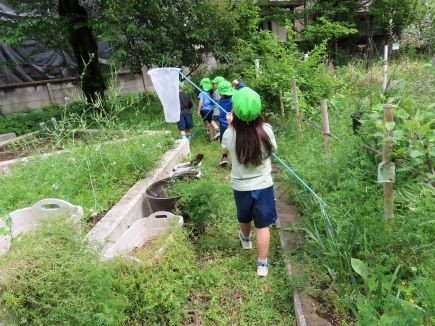 また、虫取り網と虫かごをもって、探検に出かける子どもたちもいました。「虫を発見!」「ゆっくり近づいてみよう!」など、友達に気付いたことを嬉しそうに伝える姿が多くみられました。発見した喜びを共有しようとする中で、子どもたち同士のやりとりや関りが広がっています。