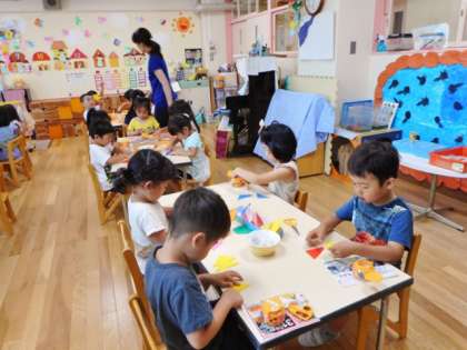 りす組は七夕飾りの三角つなぎを作りました。