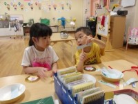 園庭の夏ミカンの木は、今年は実があまり確認できず心配していしましたが、気がつくと青い実が7センチくらいの大きさに生長していました。