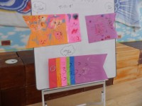 先生が用意してくれたちょうちょに、丸やお花の型の模様を貼り、棒を付けて出来上がり!