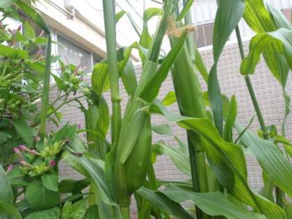 1学期にぶどう組の子どもたちが植えたとうもろこしがぐんぐん大きくなっています。