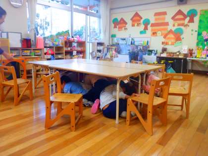 放送で地震が起こったことを知らせると、机の下に素早く避難をしました。