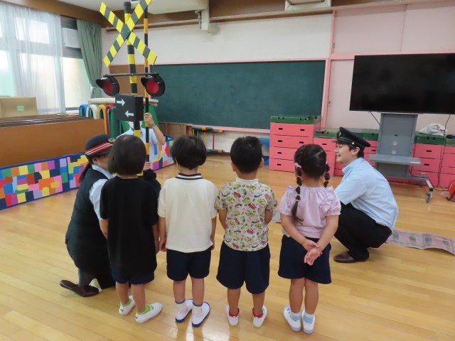 JRの職員の方が来てくださり、運転手さん、車掌さんのお仕事のビデオを見た後、実際に電車の乗り方、踏切の渡り方を体験。