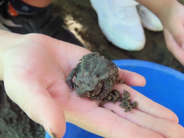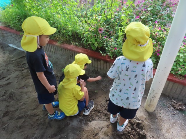 たんぽぽ組の子どもたちが砂場で遊んでいると、1匹のカエルが現れました。
