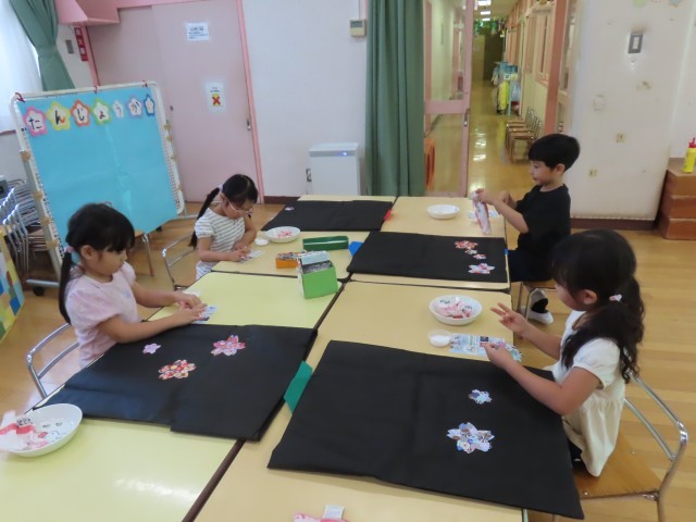 おまつりのイメージから「はっぴを着たい!」という思いをもち、衣装作りをしました。