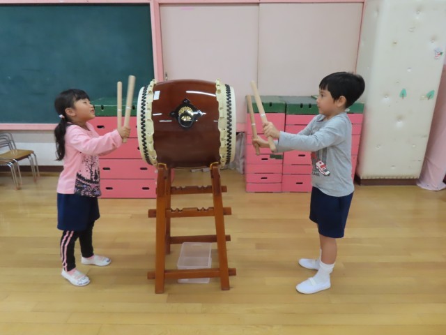 さくら組の子どもたちは、好きな遊びの中で太鼓をたたいたりマイクを使って司会をしたりなど張り切って取り組んでいます。