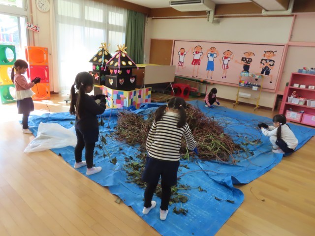 さくら組の子どもたちはつるを見て「長ーい」と驚いたり友達と綱引きのように引っ張って楽しんだりしながら、ていねいに葉っぱをとりました。