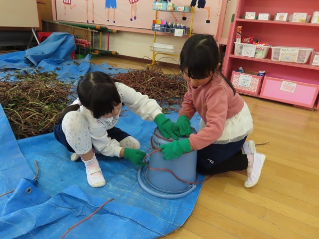 バケツにぐるぐるとつるを巻きつけてリースを作りました。「顔より大きい!」「飾るの楽しみ!」と喜んでいましたよ♪