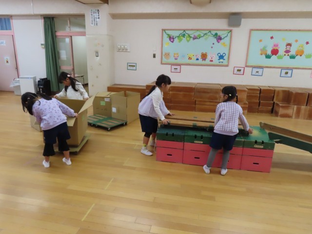 ホールに様々な大きさの段ボールや台車を用意しておくと、グループの友達と相談しながら材料選びが始まりました。