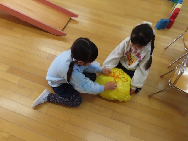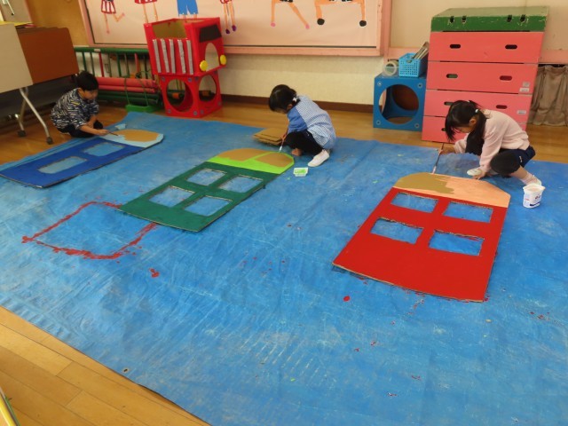 「今日は○○やるんだよね!」「「はやく作ろう!」と友達と声をかけ合い、張り切ってさくらゆうえんづくりに取り組んでいるさくら組の子どもたち。