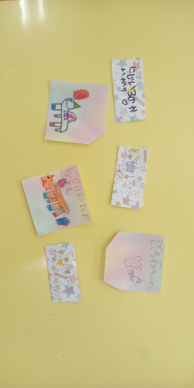 映画館のチケットを作り、自分たちの劇にじいろのかいがら を見て振り返りをしました。当日への期待が膨らんでいる子どもたちです。