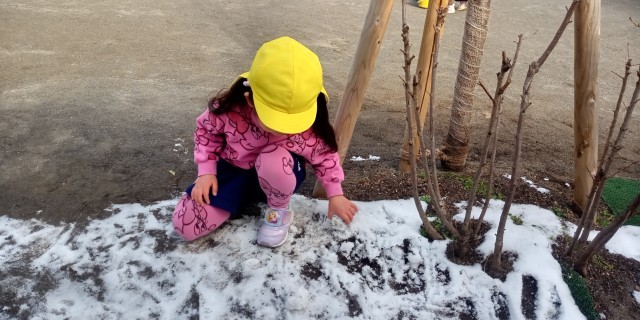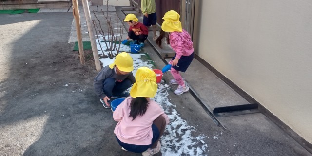 たんぽぽ組の子どもたちは、登園すると園庭に積もった雪を発見!「ゆ~きやこんこん♪」と歌いながら、雪を集めて雪だるまやご飯を作ったり、氷を見つけてと友達と見せ合ったりしていました。「雪って冷たいけど楽しいね!」と友達と笑い合いながら遊んでいましたよ♪