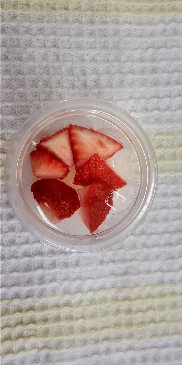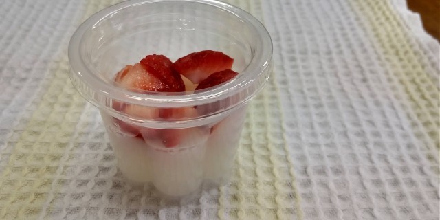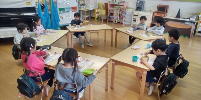 今日は、今年度最後のお弁当の日でした。机をパーティーのように並べお友達の顔を見ながら美味しいお弁当をパクパク。お楽しみの、カルピスで作った寒天ゼリー&イチゴはとーっても甘くて、みんなニコニコ。「おかわりちょーだい」の声があちこちから聞こえてきました。