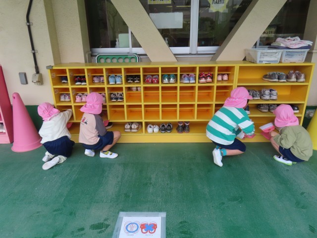 さくら組の子どもたちは、登園し自分の身支度を終えると、たんぽぽ組の身支度の手伝いに行きました。