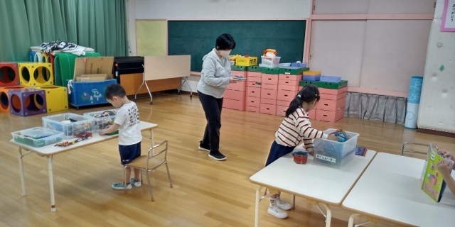 ふだんのお部屋(さくら組 たんぽぽ組)にある おもちゃとは違って、興味津々。